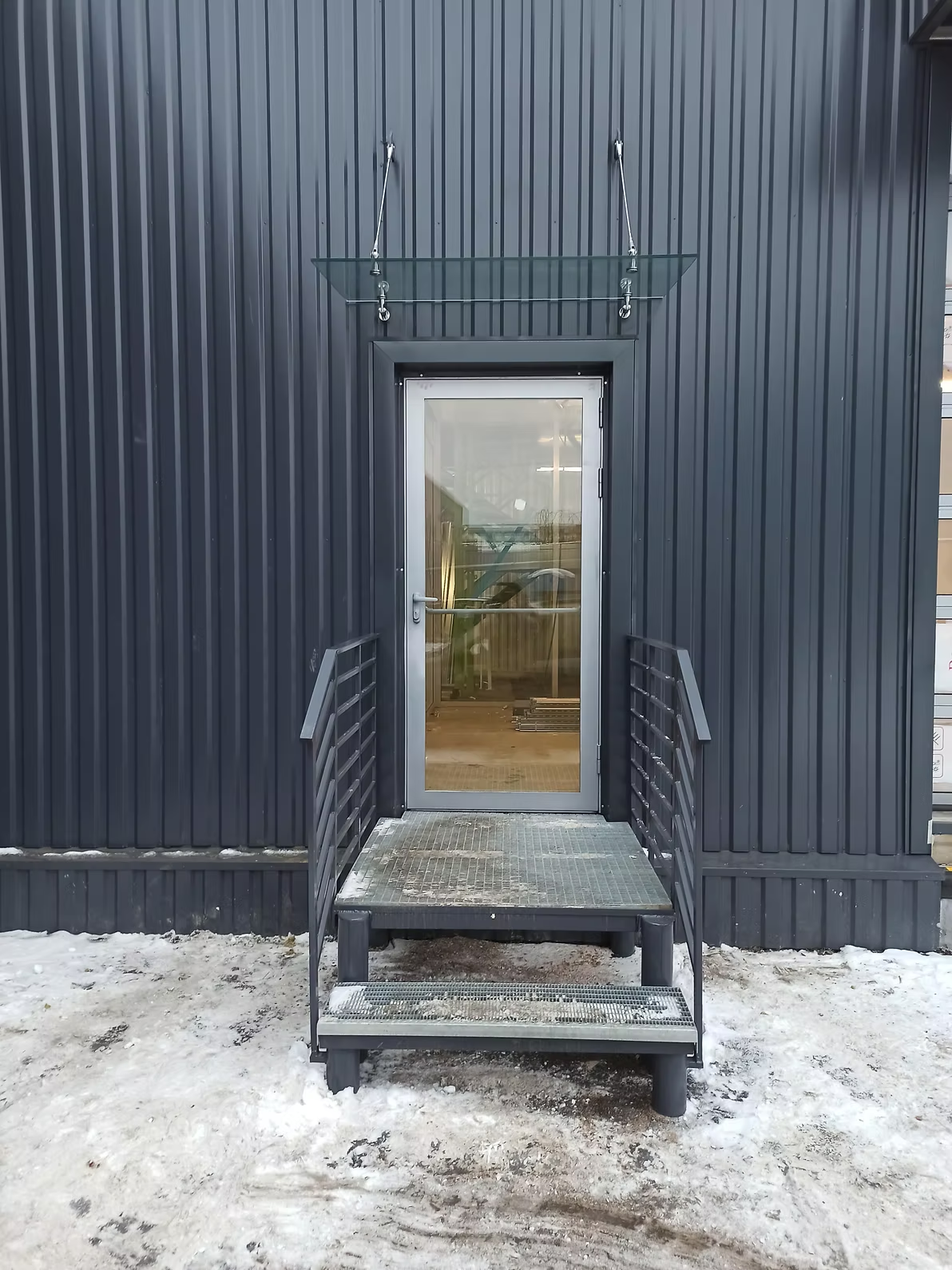 Стеклянный козырек на тягах с креплением в сэндвич панель. Фурнитура из полированной нержавеющей стали, с скрытыми фланцами крепления. Стекло прозрачное, закаленное триплекс 8*8мм.
